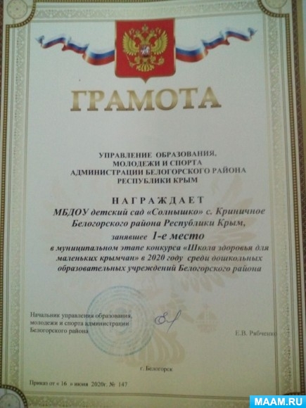 Муниципальное бюджетное дошкольное образовательное учреждение детский сад "Солнышко" с.Криничное Белогорского района Республики Крым